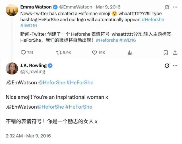 2016 年的国际妇女节,罗琳在推特上 @艾玛、HeForShe,称赞她是"鼓舞人心的女性"。
