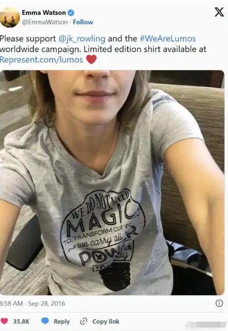 艾玛也投桃报李,号召粉丝去罗琳的慈善机构捐款,穿着印有罗琳语录的衣服拍照,两人亲密无间。