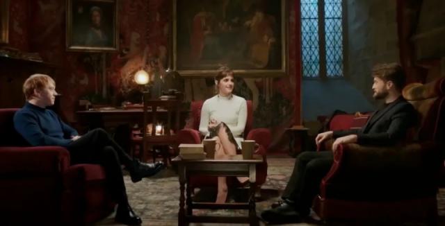 扮演赫敏的艾玛,哈利的丹尼尔、罗恩的鲁伯特 · 格林特三人在荧幕上侃侃而谈,仿佛他们才是构建了魔法世界的主人。