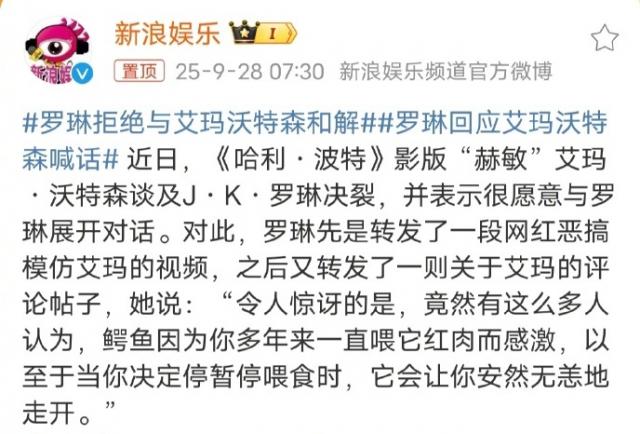 罗琳先是转发了恶搞艾玛的视频和关于她的评论,又专门写长文回应了对方,总结一下升鸿网就是人不能"端起碗吃饭 , 放下碗骂娘"。