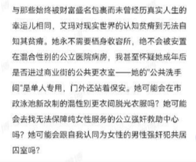 不仅如此,她还毫不掩饰的表达了对跨性别过分强调社会性别,而忽略生理性别困惑甚至是反对。