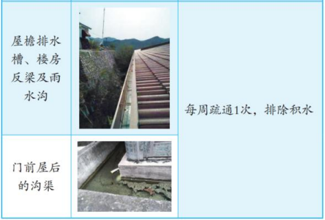 5.疏通屋檐排水槽、楼房反梁及雨水沟和门前屋后的沟渠。每周疏通1次,排除积水。