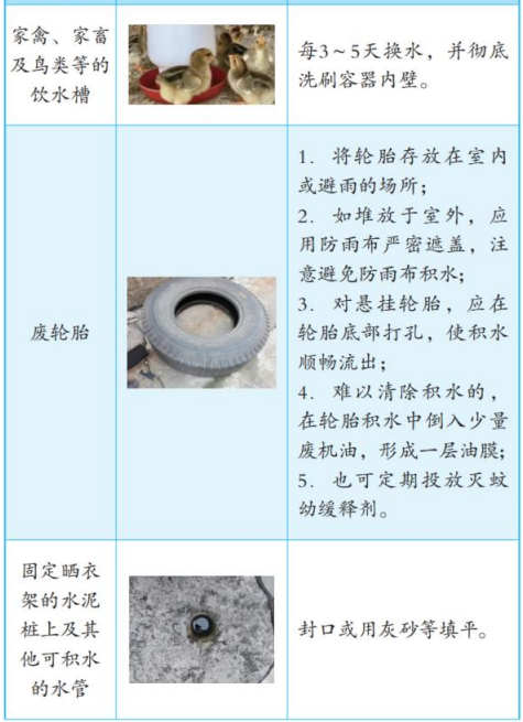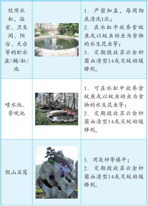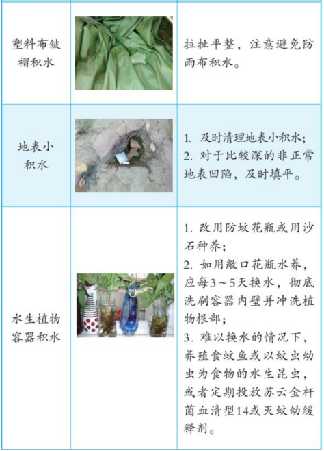 1.饮用水等有用的积水。饮用水缸等有用积水容器要严密加盖,每周应彻底清洗1次,也可在水缸中放养食蚊鱼或金鱼等。