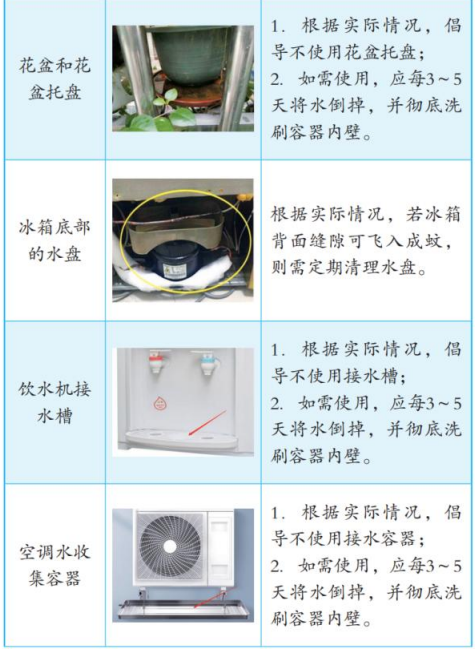 2.废水收集容器的积水。对于花盆托盘、冰箱底部的水盘、饮水机接水槽、空调水收集容器等,根据实际情况,倡导不使用接水托盘。如需使用,应每3~5天将水倒掉,并彻底洗刷容器内壁。
