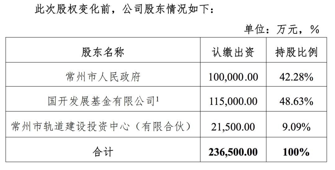 此次股权变化前,公司股东情况为:常州市人民政府持股42.28%,国开发展基金有限公司持股48.63%,常州市轨道建设投资中心(有限合伙)持股9.09%。