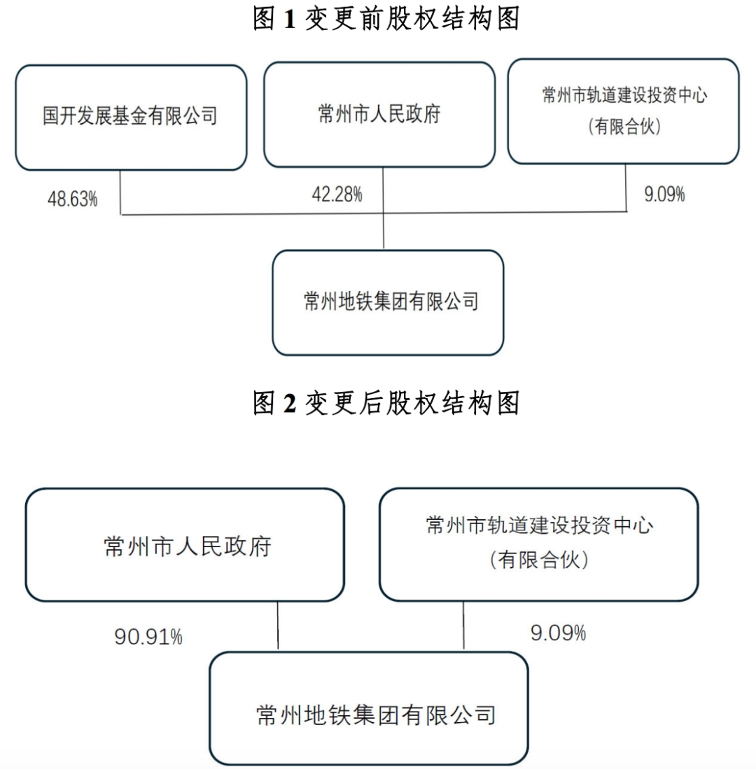 根据《常州地铁集团有限公司股权转让协议》以及《常州地铁集团有限公司股东会决议》,股东国开发展基金有限公司将其持有的常州地铁集团有限公司48.63%的股权转让给常州市人民政府。